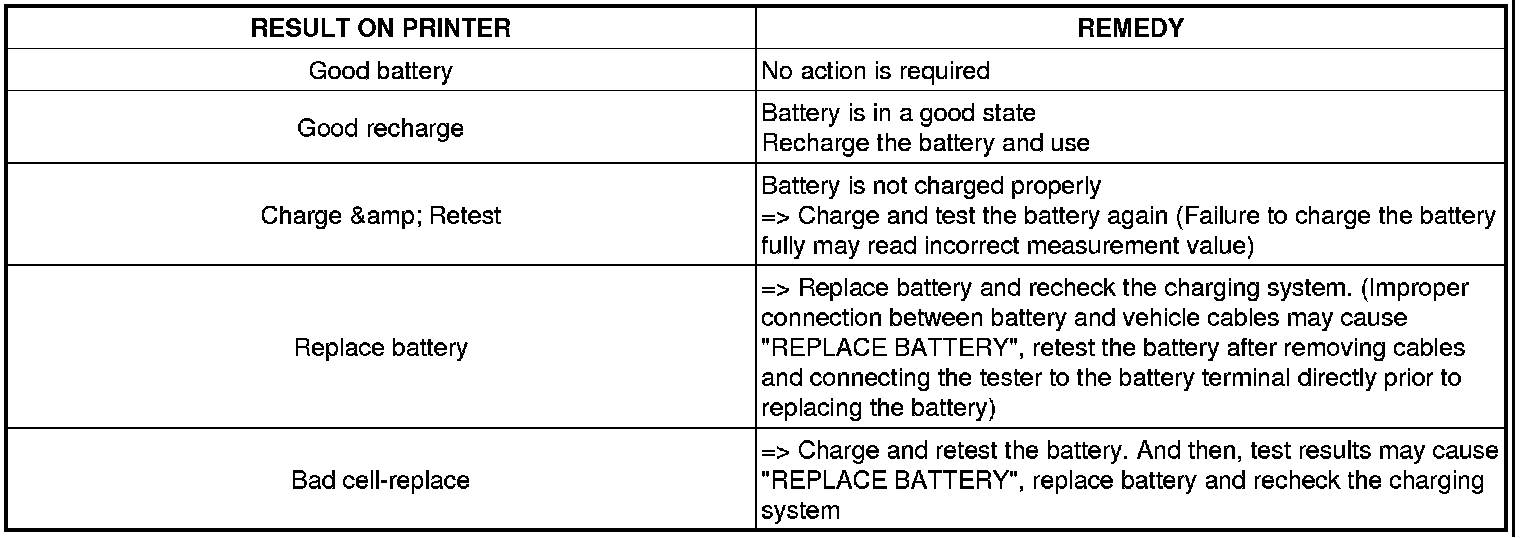 A relevant action must be given according to the test results by referring to the battery test results as shown in the table below.