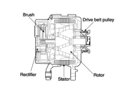 The main components of the generator are the rotor, stator, rectifier, capacitor brushes, bearings and V-ribbed belt pulley. The brush holder contains a built-in electronic voltage regulator.