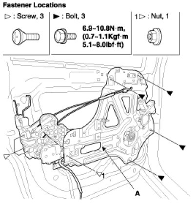 4. Loosen the door module mounting bolts, then remove the door module (A).