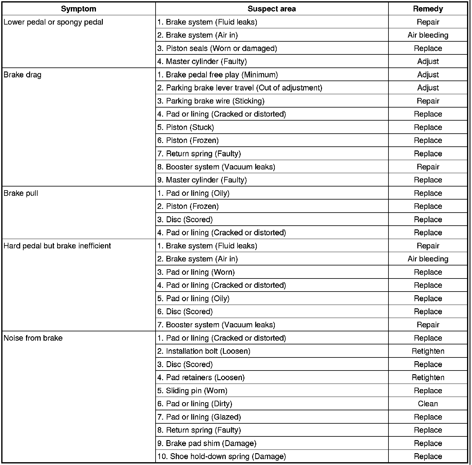 TROUBLESHOOTINGPROBLEM SYMPTOMS TABLEUse the table below to help you find the cause of the problem. The numbers indicate the priority of the like cause of the problem. Check each part in order. If necessary, replace these parts.