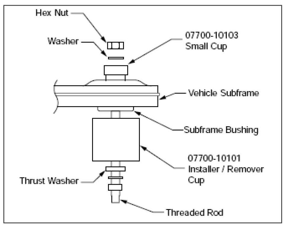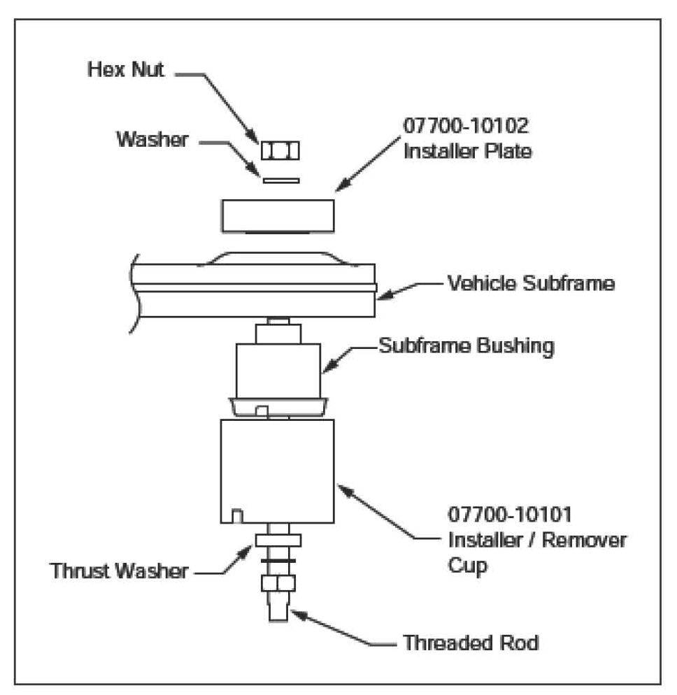 Insert the threaded rod through the deep end of the Installer/Remover Cup, then through the new bushing and finally through the sub-frame and Installer Plate.