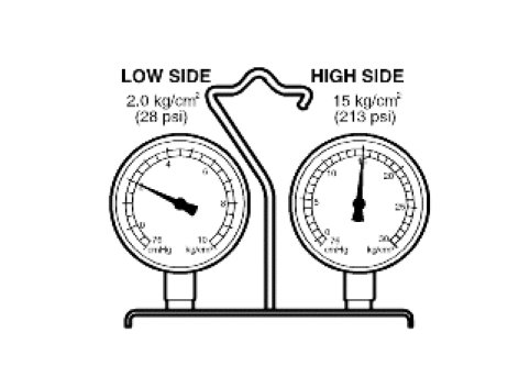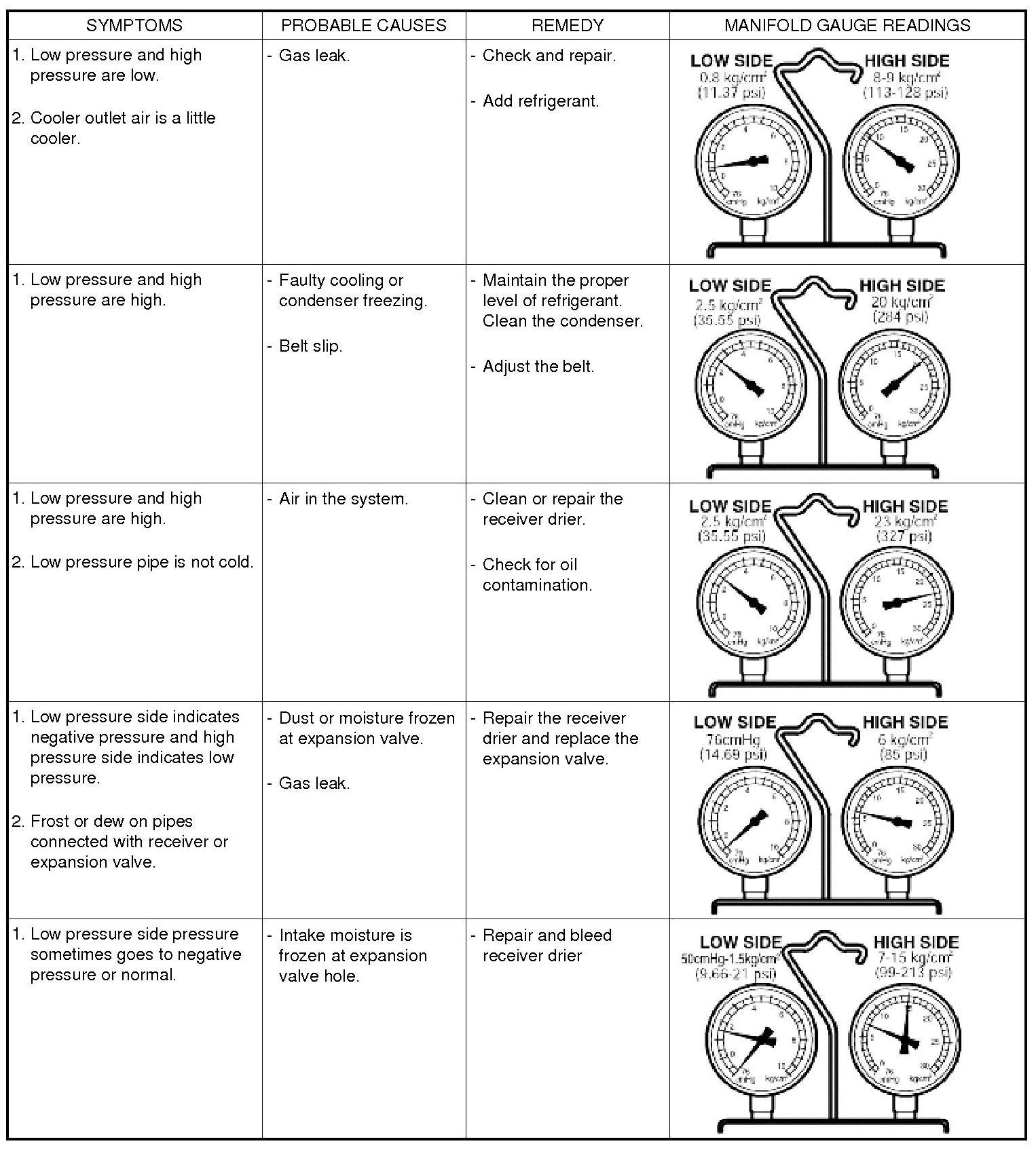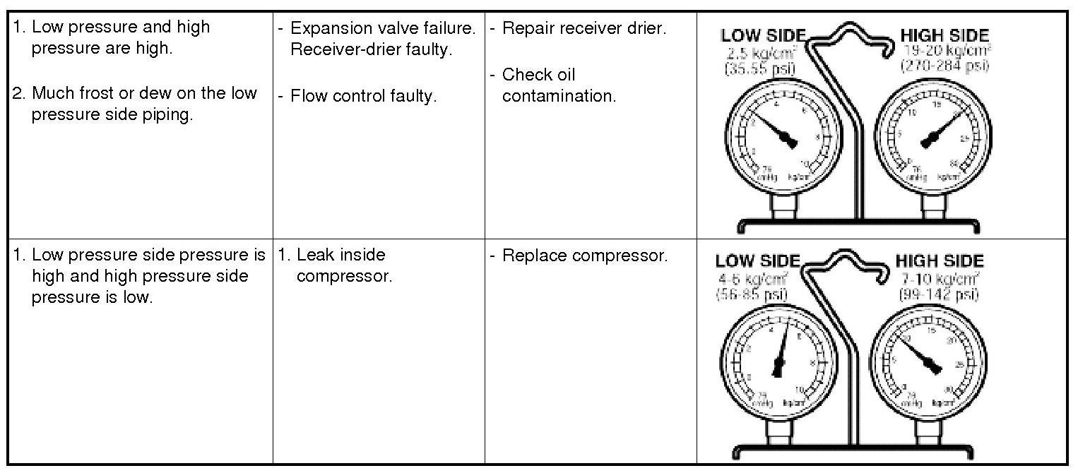If cooling cycle is operating normally, the manifold gauge reading will be approx. 21-28psi (1.5-2.0kg/cm2) for the low pressure side and approx. 206-213psi (14.5-15kg/cm2) for the high pressure side. Inlet temperature should be 30-35°C(80-95°F), with the engine at 2,000 rpm, maximum cooling selected, and the blower on highest level.