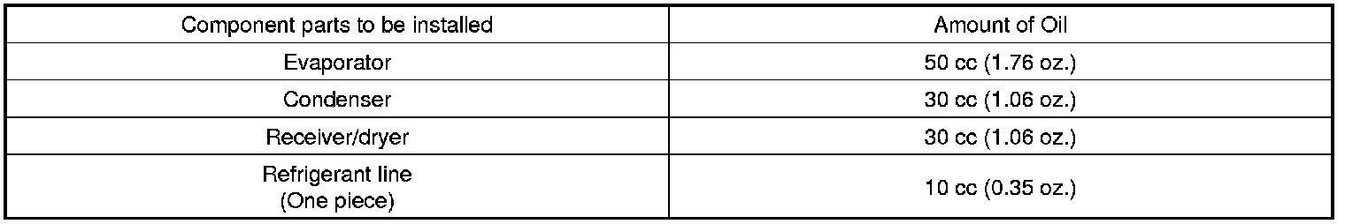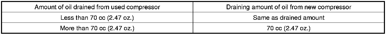 150 cc (5.29 oz.) of oil is charged in compressor (service parts). So it is necessary to drain the proper amount of oil from the new compressor.