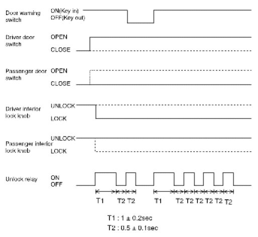 1. If the door switch of driver side or passenger side is locked when door warning switch is turned on and (CAN communication reception), driver side or passenger side door is open, it executes unlock output for 1 second. If the passenger side door remains locked even after the unlock output, it repeats on and off 3 times with the time interval of 0.5 second.