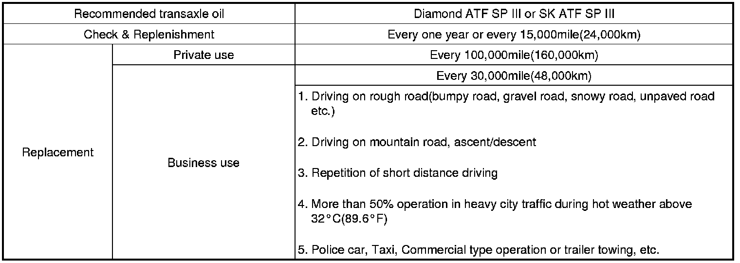** The quantity in the chart above is for the reference. The actual filling quantity of the automatic transaxle fluid must be set according to 'INSPECTION' or 'REPLACEMENT' process of the automatic transaxle fluid.