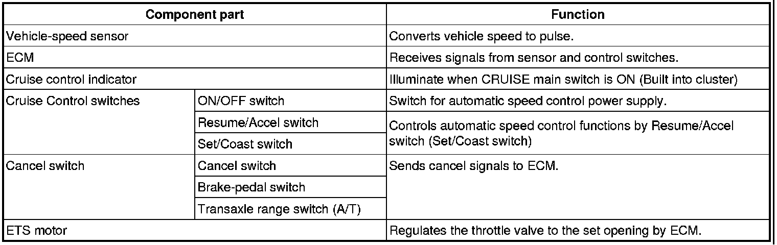 The main components of cruise control system are mode control switches, transaxle range switch, brake switch, vehicle speed sensor, ECM and ETS motor that connect throttle body.