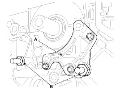 1. Install the tensioner adapter (A) and the timing chain guide bolts (B).