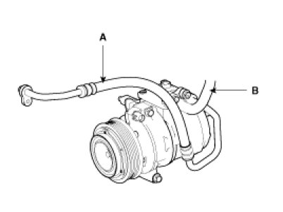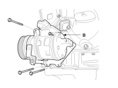 5. Remove the bolts, then disconnect the suction line (A) and discharge line (B) from the compressor. Plug (C) or cap the lines immediately after disconnecting them to avoid moisture and dust contamination.