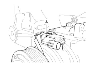 6. Disconnect the compressor clutch connector (A), and then remove 4 mounting bolts and the compressor.