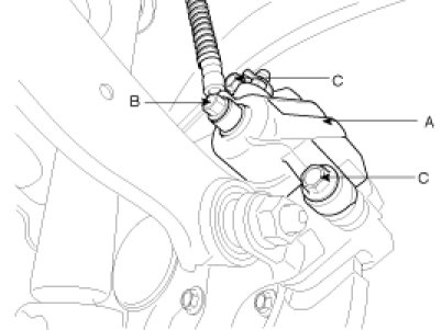 1. Remove the brake hose bolt (B) and the guide rod bolts (C) from the caliper assembly (A).