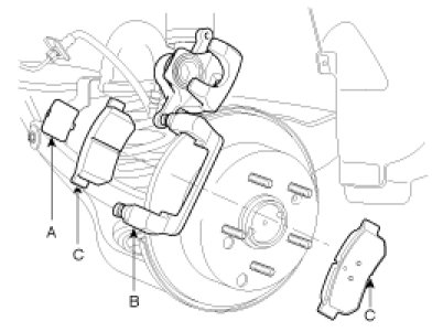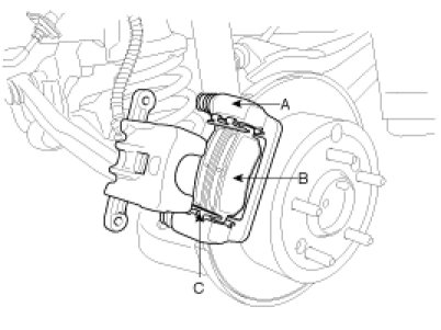 5. Install the brake pads (B) and pad shims (C) on the pad retainer correctly. Install the pad with the wear indicator on the inside. If you are reusing the pads, always reinstall the brake pads in their original positions to prevent a momentary loss of braking efficiency.