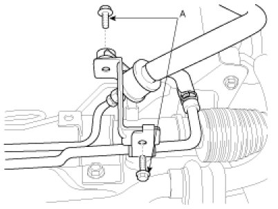 1. Drain the power steering fluid by disconnecting return hose (A).