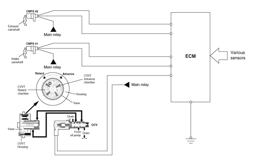 The CVVT changes the phase of the intake camshaft via oil pressure.It changes the intake valve timing continuously.