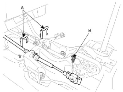 6. Install the guide member (A) of the select cable (B).