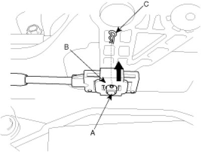 7. Adjust the slide clip (B) to fit it into the select lever pin (A) and install the snap pin (C).