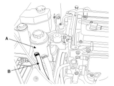2. Remove the return hose(B) from the power steering reservoir tank(A).
