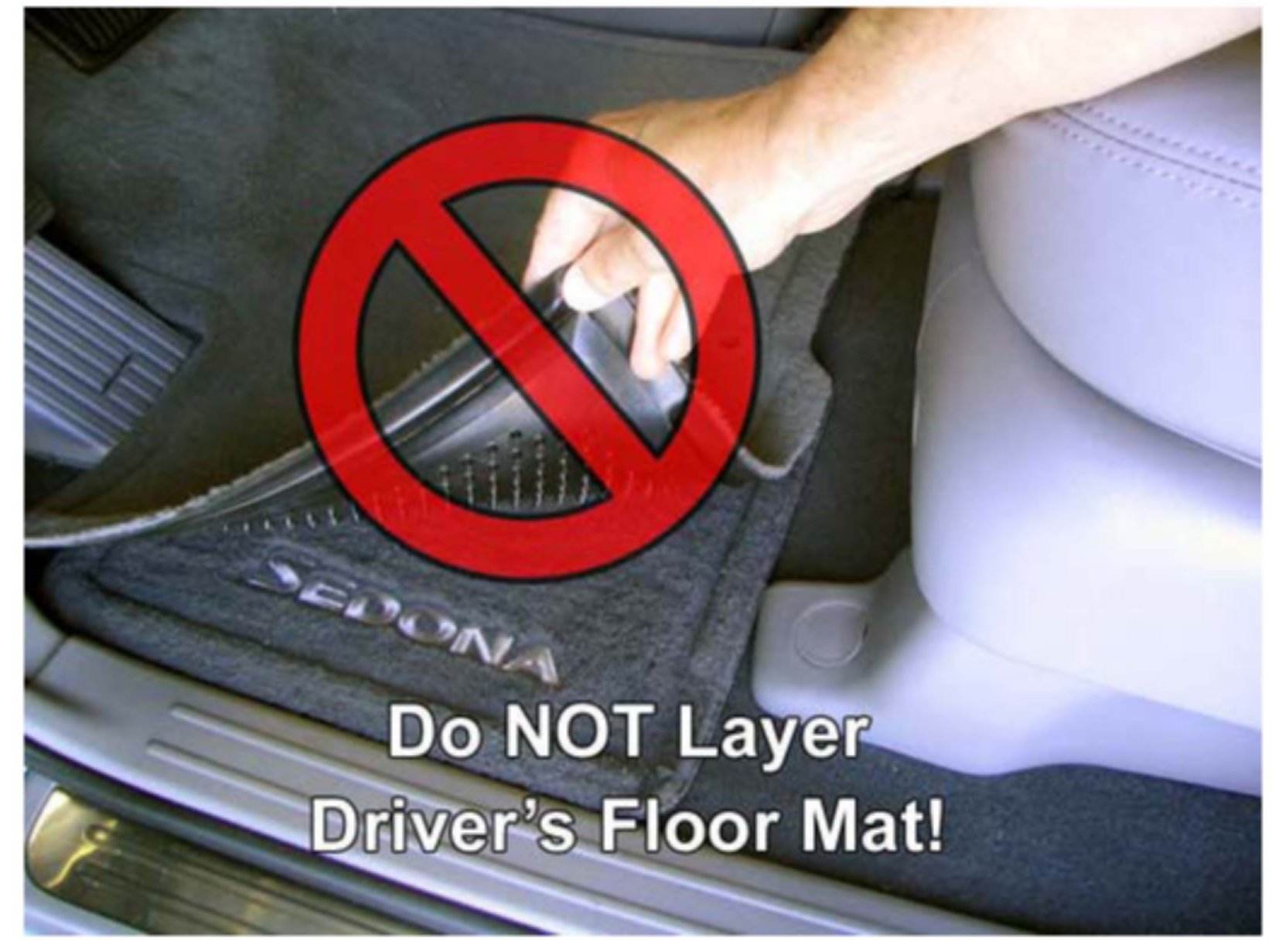 Customer who purchase floor mats to self-install should be advised at time of purchase of proper floor mat installation. They should be reminded to remove any previously installed driver's side floor mat first, and not place any additional floor mat on top of an existing driver's floor mat.