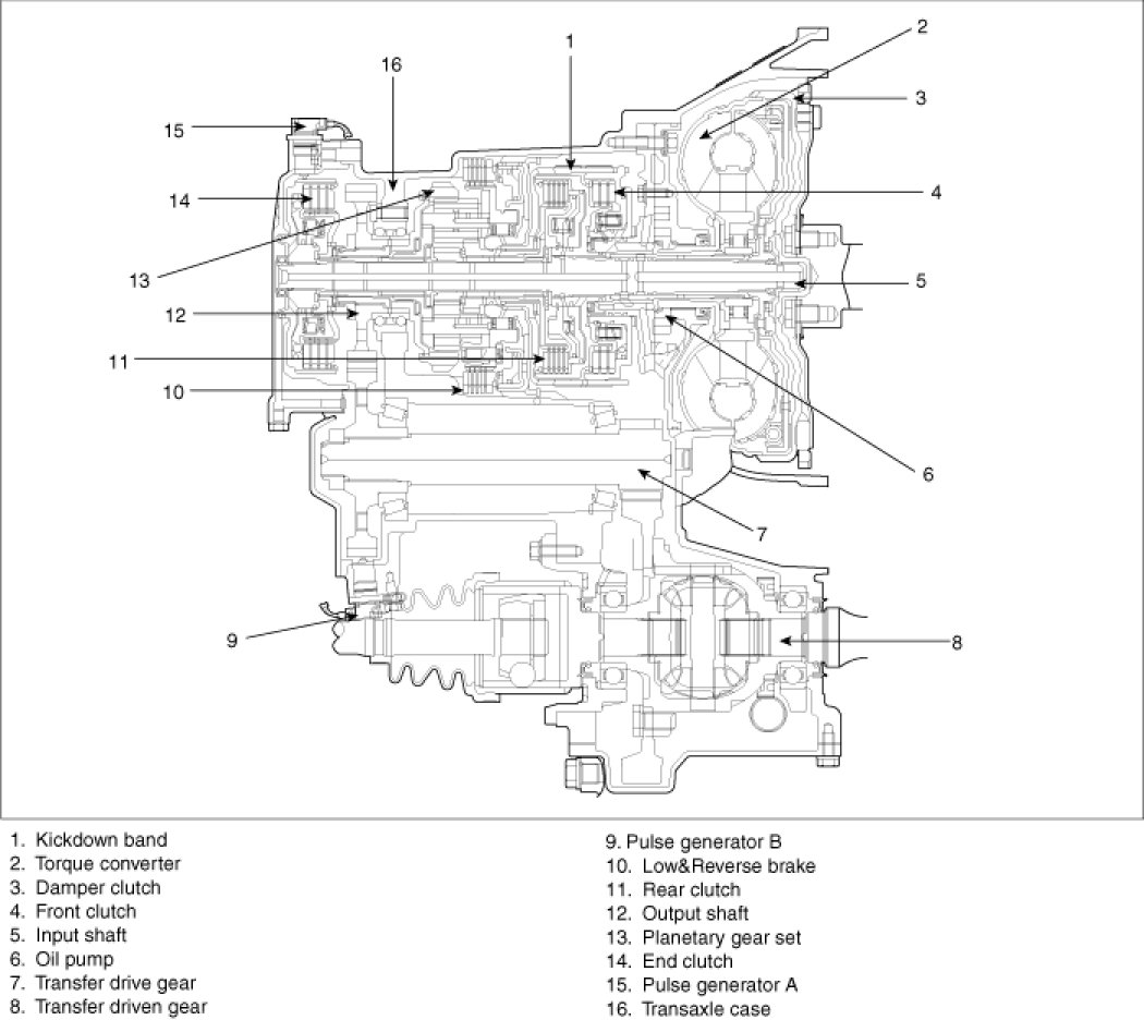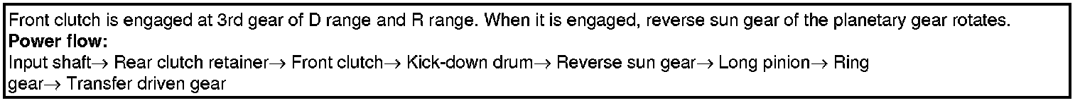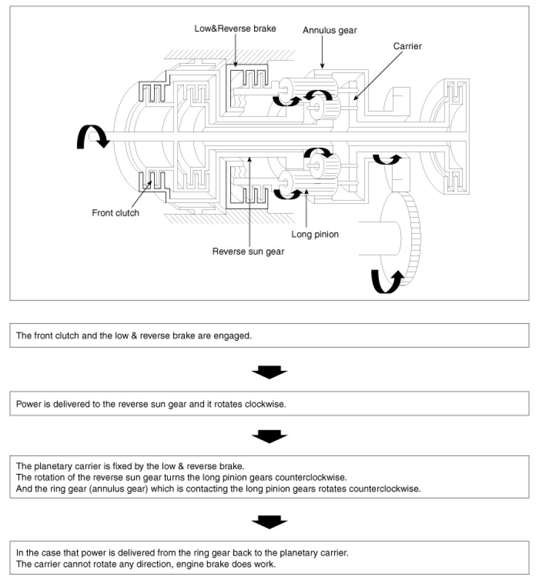 For each shift condition, certain holding units in the transaxle are used. Knowing which holding element is used and how they are connected in the transaxle, we can trace the power flow through the transaxle for each shift condition. One set of pinions, the short pinions, meshes with the reverse sun gear.