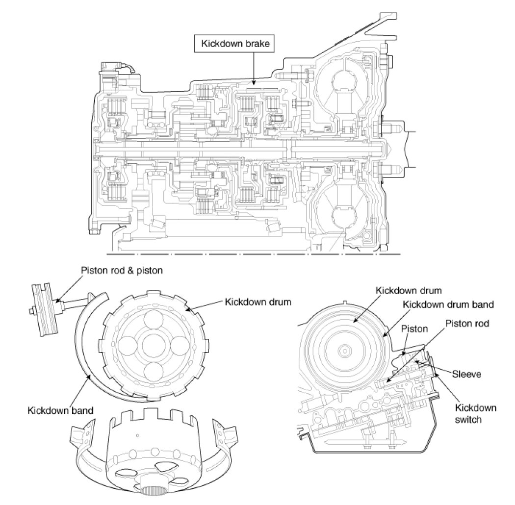 The reverse sun gear is connected to the front clutch retainer via the kickdown drum, while the forward sun gear is connected to the rear clutch hub.