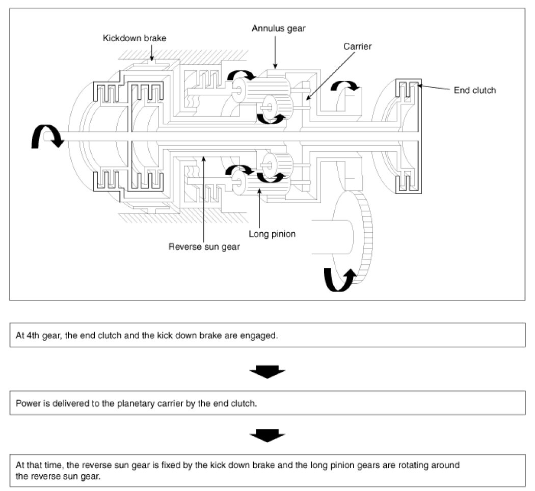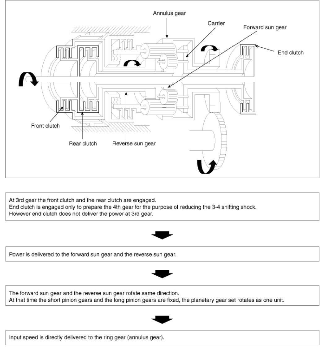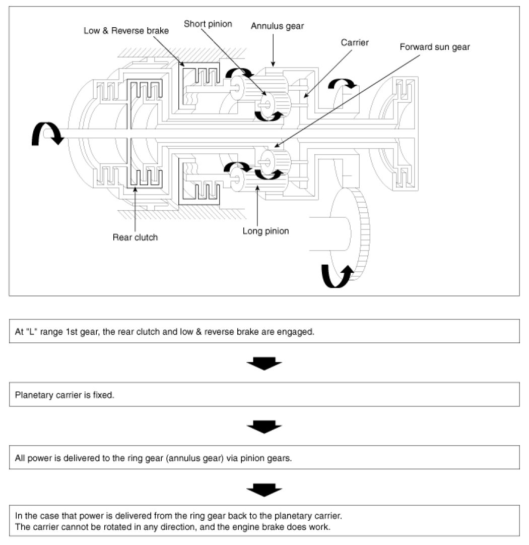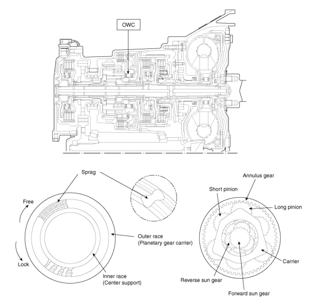The other set, the long pinions, meshes with both the forward sun gear and with the annulus gear. The two sets of pinions also mesh with each other in pairs. The pinion carrier is built as a unit with the low reverse brake hub and the outer race of the one-way clutch. Power input is to either of the two sun gears.