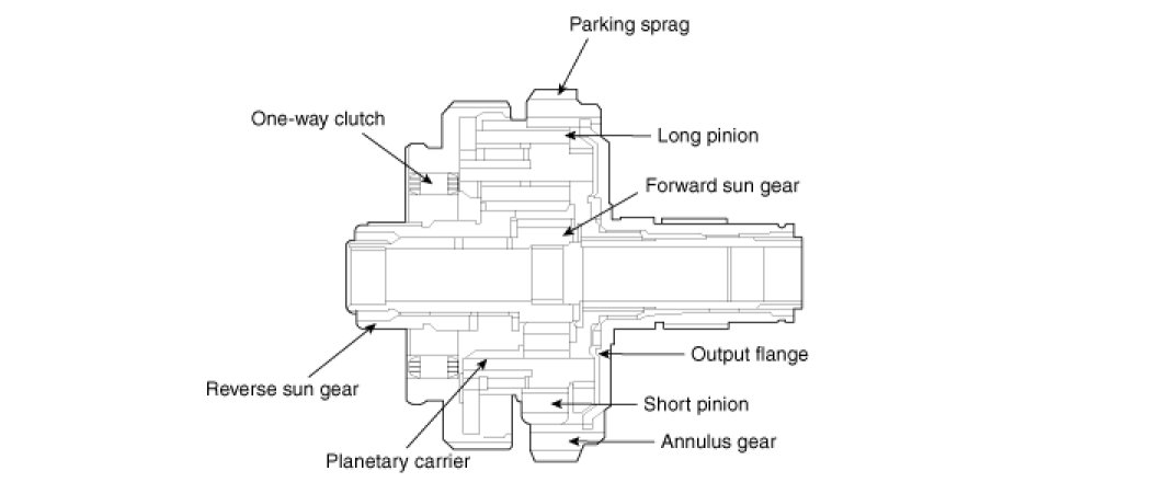 The planetary gear set incorporated in this transaxle consists of a forward sun gear, a reverse sun gear, a short pinion, a carrier to support both pinions, and an annulus gear.