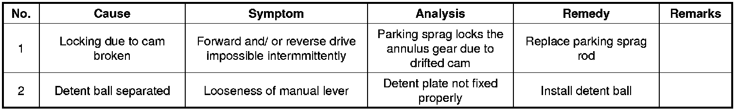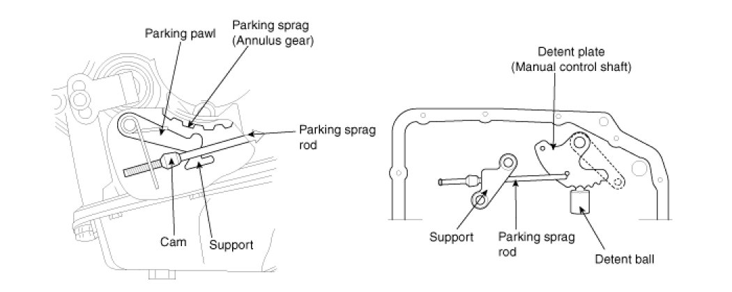 When the shaft is in the "P" range, the parking pawl engages with the parking sprag provided on outer circumference of the annulus gear to fasten the output shaft, to prevent the wheels from rotating. In other words, when the select lever is set to the "P" range, the detent plate and the parking sprag rod move in the direction of arrow, causing the cam on the parking sprag rod to push up the parking pawl to engage with the sprag.
