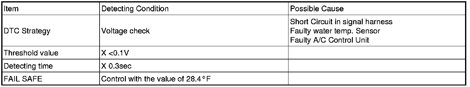 The ECM sets DTC B1203 if there is a short circuit in water temp sensor signal harness or the measured voltage value of the sensor is less than the threshold value (0.1V)