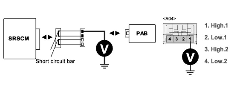5. Measure voltage between terminal "1 or 2" of the PAB harness connector and chassis ground.