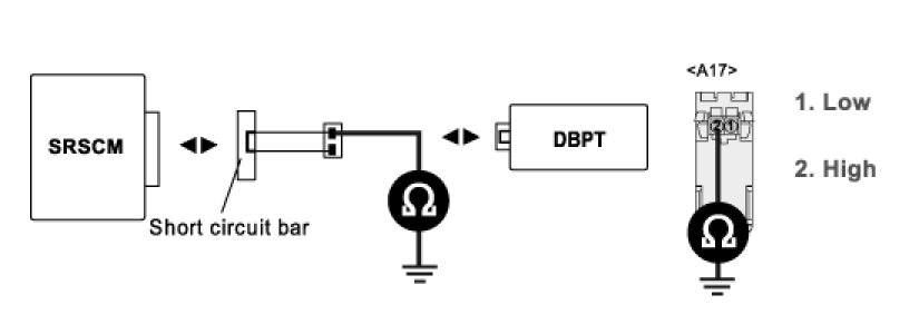 4. Measure resistance between terminal "1" or "2" of the DBPT harness connector and chassis ground