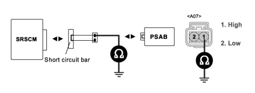 4. Measure resistance between terminal "1" or "2" of the PSAB harness connector and chassis ground.