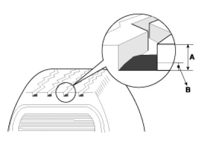 When the tread depth of the tires is less than 1.6 mm(0.063 in), the wear indicators (B) will appear.