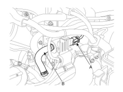 3. Disconnect the vapor hose (B) which is connected to the intake manifold from the PCSV.