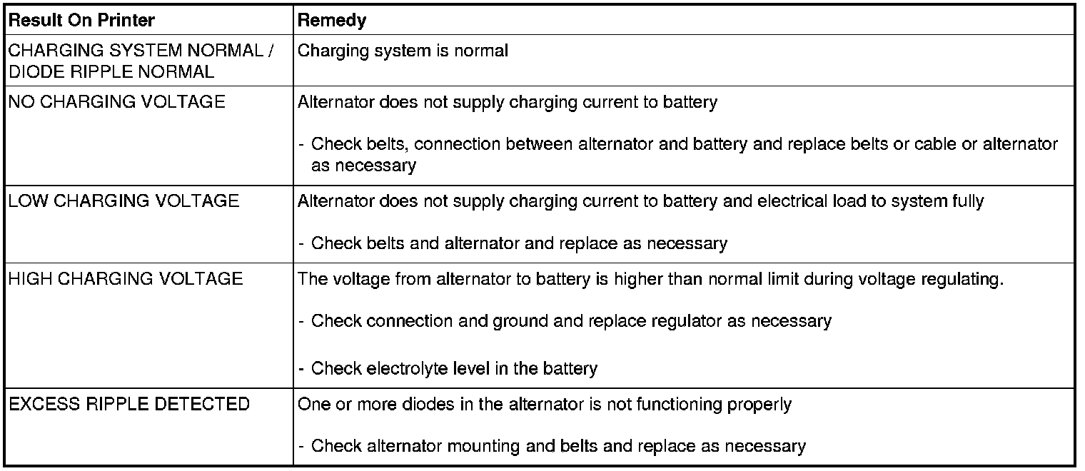 Shut off engine end disconnect the tester clamps from the battery. Refer to the following table and take the appropriate action as recommended by the Micro 570.