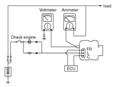 1. Check to see that the voltmeter reads as the same value as the battery voltage. If the voltmeter reads 0V, and the open circuit in the wire between alternator "B" terminal and battery (+) terminal or poor grounding is suspected.