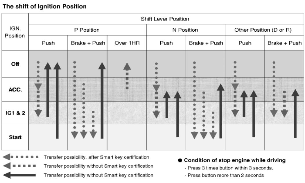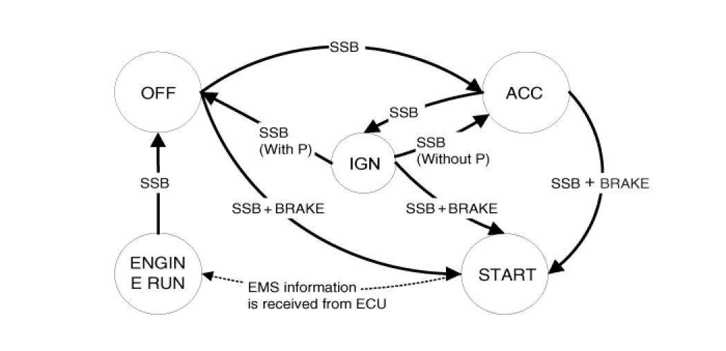Referring to the terminals, the system states described in the table above are same as those one found in a system based on a mechanical ignition switch. The one of distinction with Mechanical-Ignition-Switch based system is that the BES system allows specific transition from [OFF] to [START] without going through [ACC] and [IGN] states.