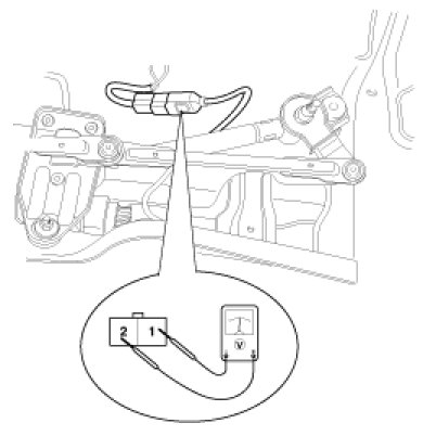 4. Turn the ignition switch ON and the windshield deicer switch ON, then measure the voltage between the terminals of harness side deicer connector.