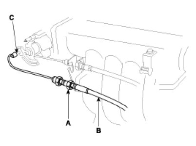 1. Loosen the locknuts(A) and disconnect the actuator cable (B) from the throttle linkage(C).