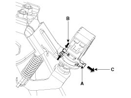 2. Release locking plate by pushing the hooks (B) carefully, and then pull the locking plate (A) as indicated by the arrow (C).