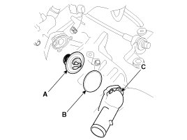 3. Remove water inlet fitting (C), gasket (B) and thermostat (A).