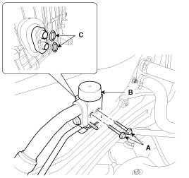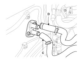 6. Disconnect the inlet (C) and outlet (D) heater hoses from the heater unit.