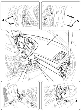 16. Loosen the cowl cross member mounting bolts (A) and then remove the crash pad and heater blower unit (B).