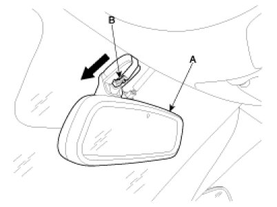 1. Push the inside rear view mirror base (A) down to wards the inside rear view mirror assembly (B).