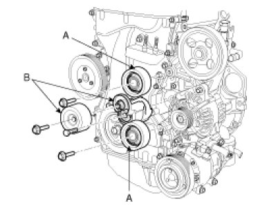 8. Remove the idler (A) and drive belt tensioner (B).