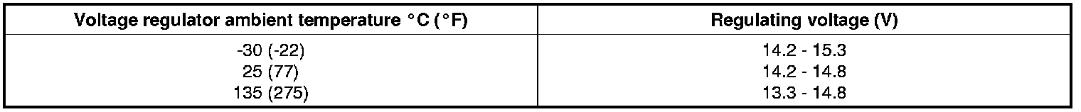 1. If the voltmeter reading agrees with the value listed in the regulating voltage table below, the voltage regulator is functioning correctly. If the reading is other than the standard value, the voltage regulator or the alternator is faulty.