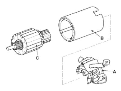 4. Remove the brush holder assembly (A), yoke (B) and armature (C).