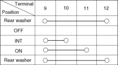 With the rear wiper & washer switch in each position, make sure that continuity exists between the terminals below. If continuity is not as specified, replace the multifunction switch.