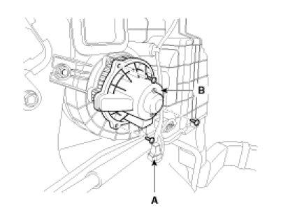 4. Remove the blower motor (B) after loosening the mounting screws.