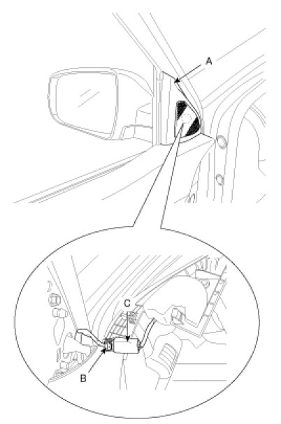 2. Push the lock pin (B), then remove the tweeter speaker connector (C).