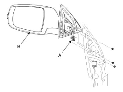3. After disconnecting the connector (A), then remove the outside rear view mirror (B).