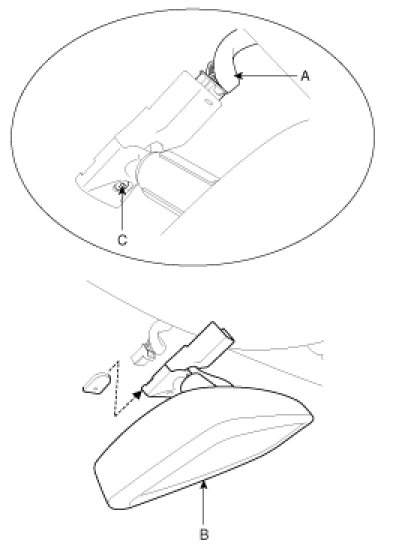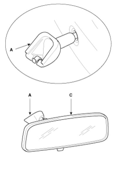 1. Push the inside rear view mirror base (A) up to remove the inside rear view mirror assembly (C).
